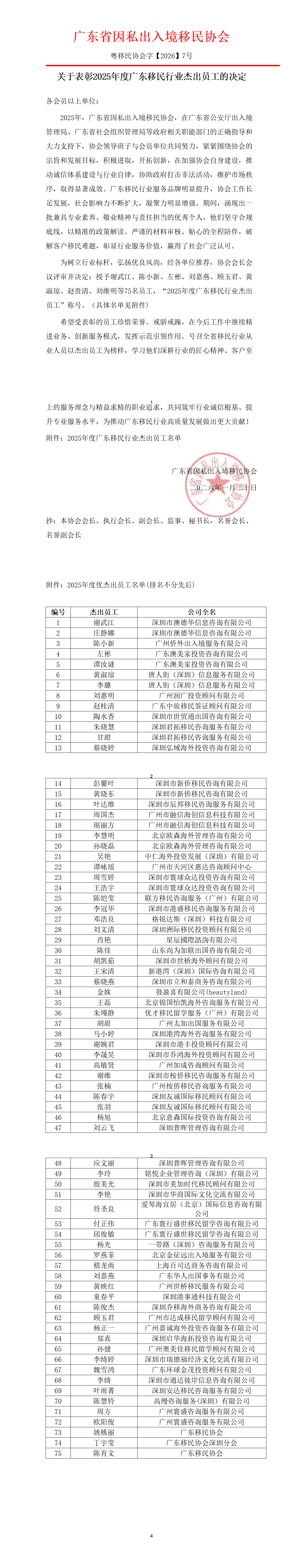 关于表彰2025年度广东移民行业杰出员工的决定