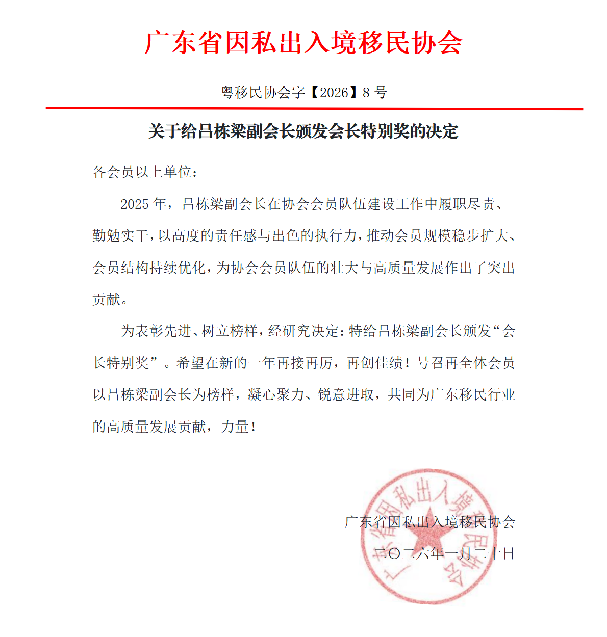 关于表彰2025年度广东移民行业杰出员工的决定